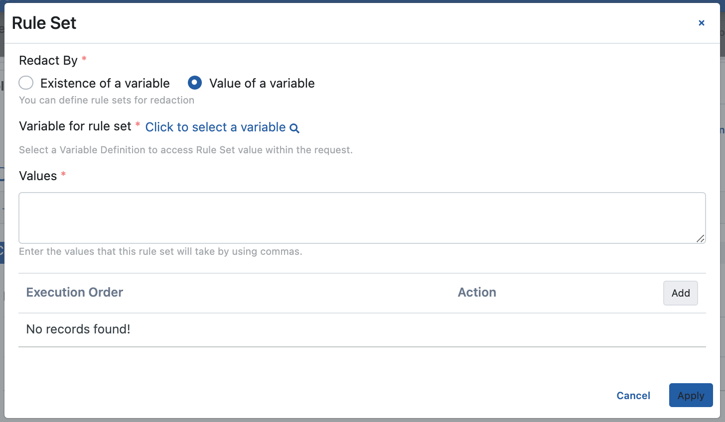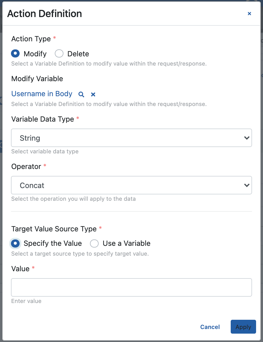 - Delete: The value of an existing field or the entire field in the header, parameter or body of the request/response is deleted.