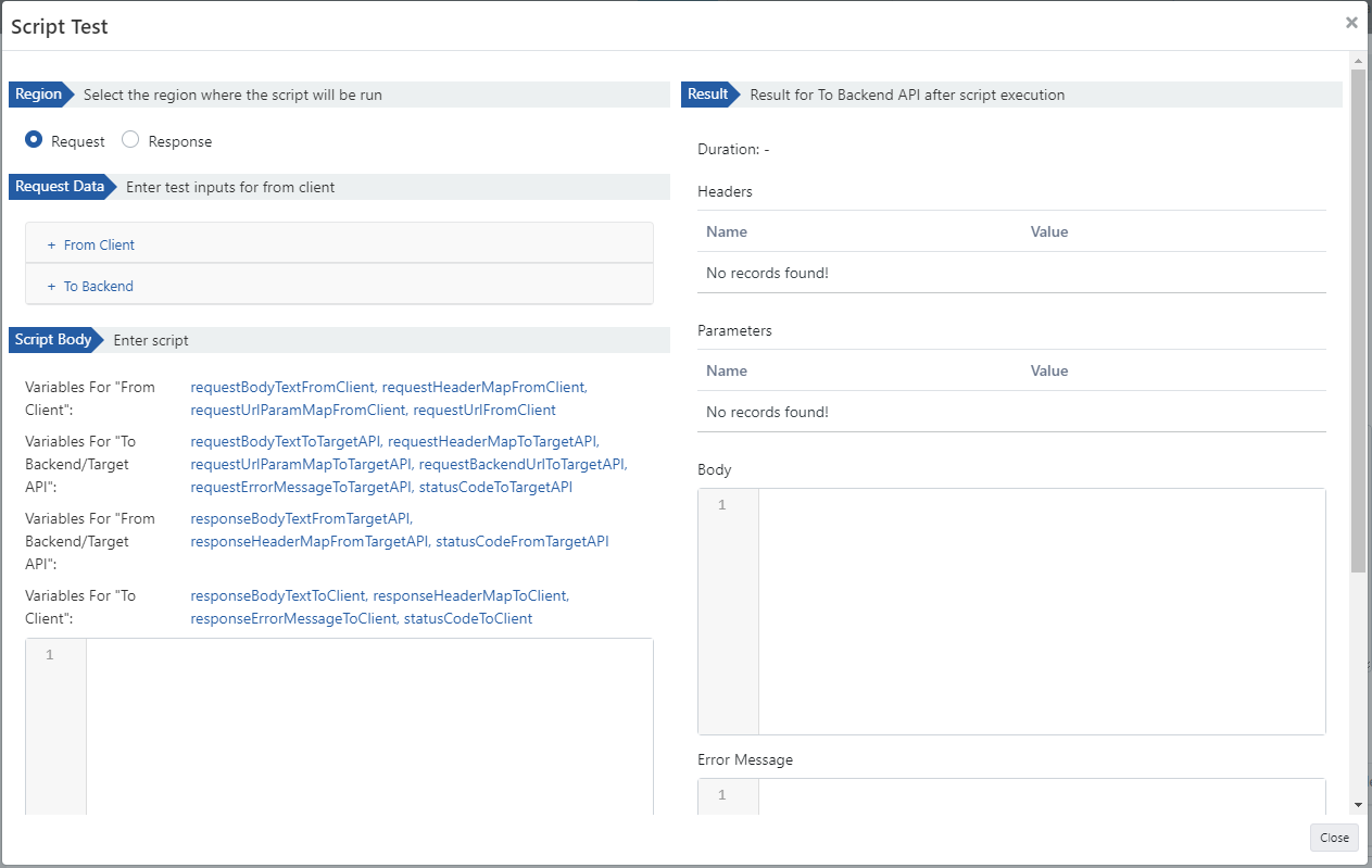 | Script Body | Script code is written to operate on the request or response pipeline. It can be added to the body area by clicking on the links of the variables given according to the regions of the message. |