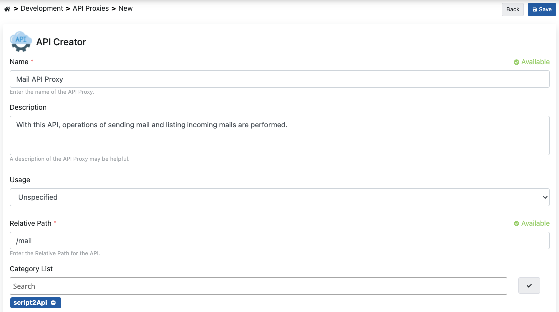 REST API definition is made by entering general information of the API easily on the Script-2-API screen.