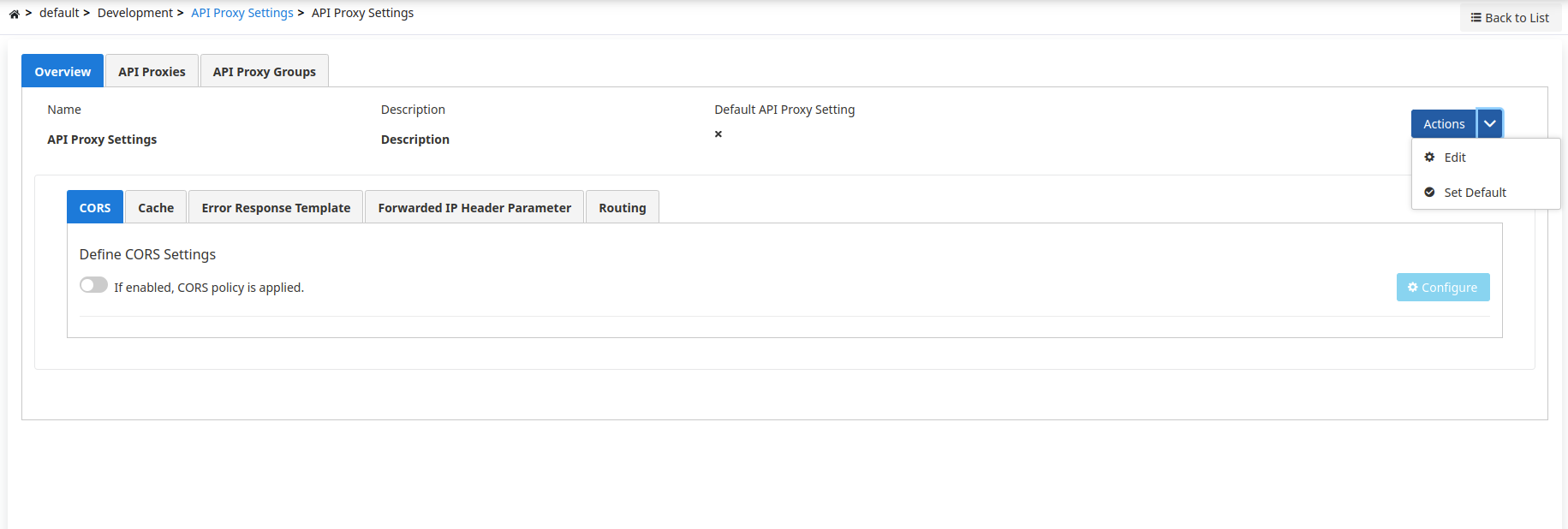 Default for API Proxies | This setting group determines whether it will be the default setting for newly created API Proxies/API Proxy Groups. To make it the default, the "Set Default" option can be used from the "Actions" menu. |