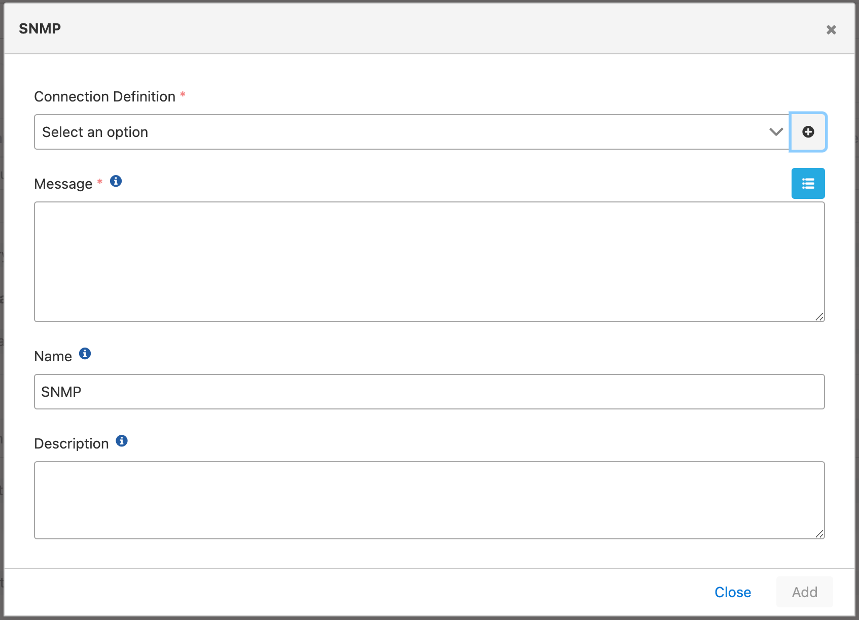 Apinizer Documentation Developer Guide Development Actions/Connectors Current: SNMP Connection SNMP Connection A message can be sent to the destination on the specified SNMP connection every time the job definition or action is executed.The image containing SNMP settings is given below:The fields used for SNMP configuration are shown in the table below.FieldDescriptionConnection DefinitionThe predefined protocol can be selected or a new one can be added. Click to create a new definition.MessageThe details of the message to be sent are written. Variables can be used in Message field. ×