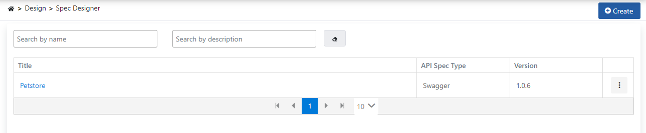 A new API Spec can be created by clicking the Create button at the top right of the list interface.
