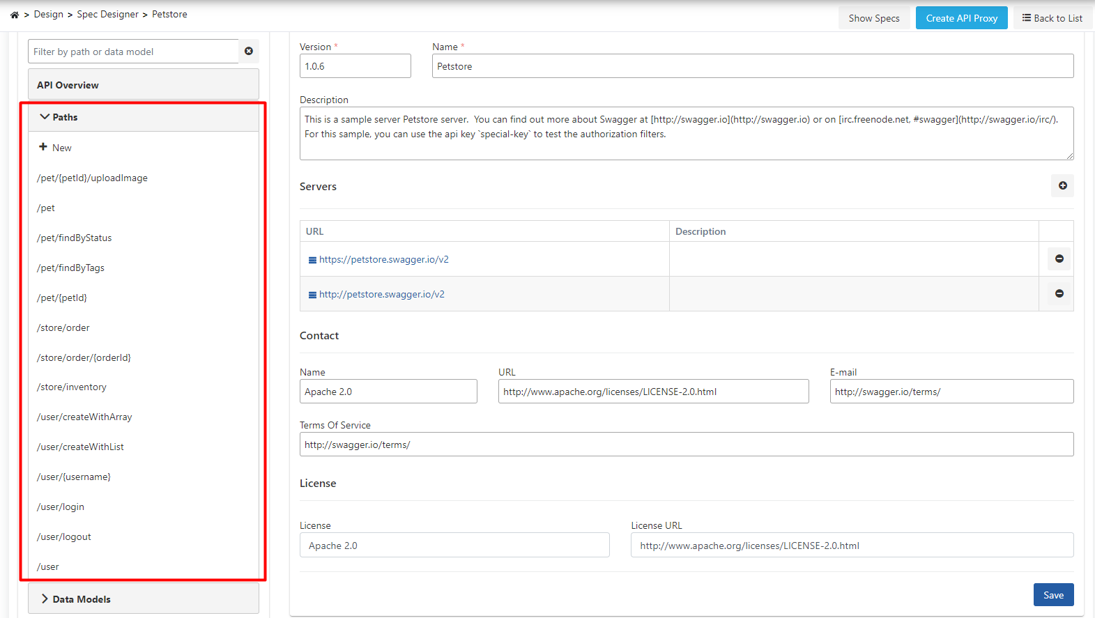 Please refer to https://swagger.io/specification/ for a detailed explanation of the information entered through the API Spec Editor.