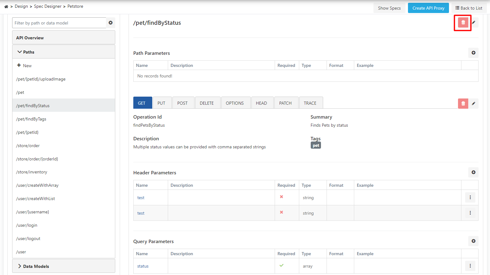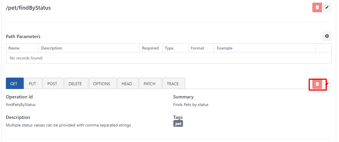In the image above, the /pet/findByStatus address has been selected by the user, and the Get operation defined for this Path is automatically selected and its details are displayed.