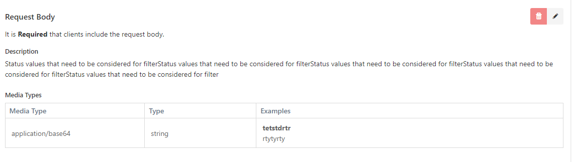 This is the section where sample request bodies for this Operation can be managed. A sample request body can be defined for one or more Media Types.