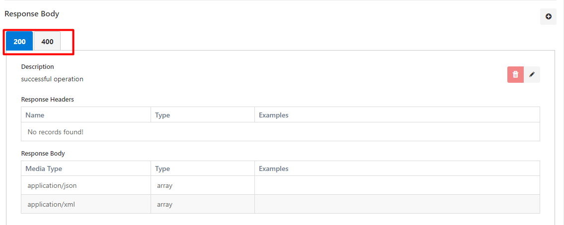 - For the 200 code, two different Media Types can be returned as application/json or application/xml.