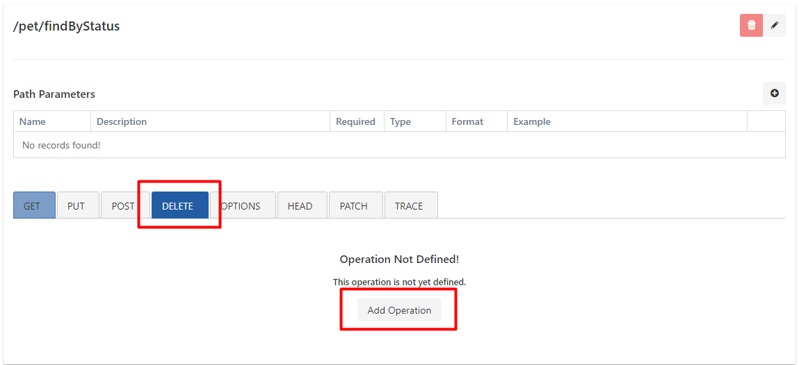 When a Path is selected, the Operations defined for that Path are displayed with the corresponding HTTP Methods colored. For uncolored HTTP Methods, an Operation has not yet been defined. If an Operation is desired to be defined for any of these, the HTTP Method is selected. With this selection, it appears that no Operation has been defined for the selected method yet, and a new one can be added by pressing the Add Operation button.