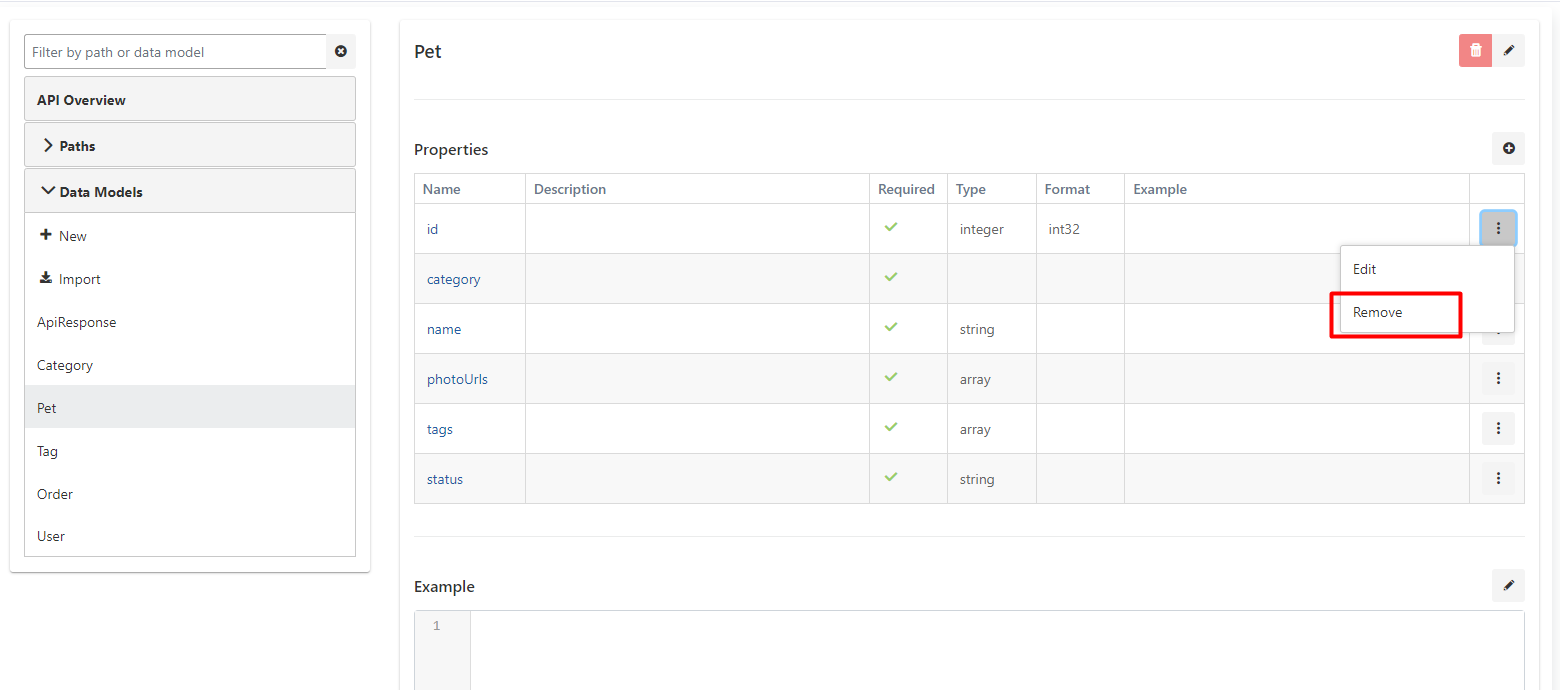 The record can be deleted by clicking the menu button in the rightmost column of the record to be deleted in the API Definition Document list and selecting Remove.