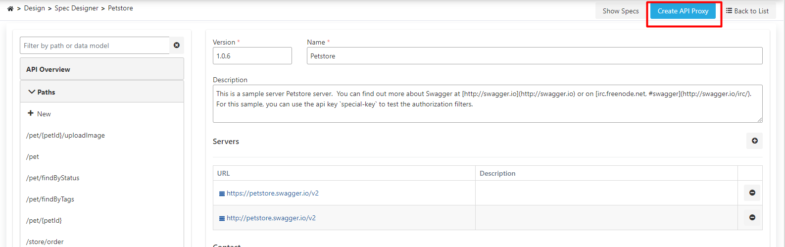 An API Proxy can be created using this API Spec by clicking the Create API Proxy button in the update interface of the API Definition Document.