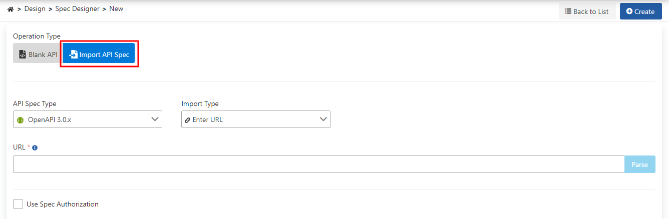 The second option to create a new API Spec is to import an existing API Spec. For this, the Import API Spec option is selected.