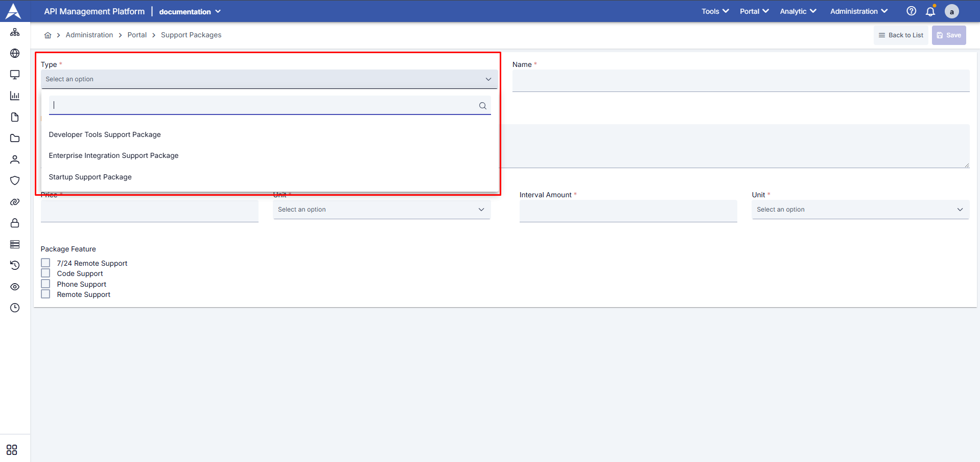 The categories defined on the Support Package Type page (Developer Tools, Enterprise Integration, Startup, etc.) are presented as a selection list in the “Support Packages” section when creating a new support package. You can categorize your packages by creating multiple types as needed. For information on using the Support Packages page, refer to the Support Packages documentation.