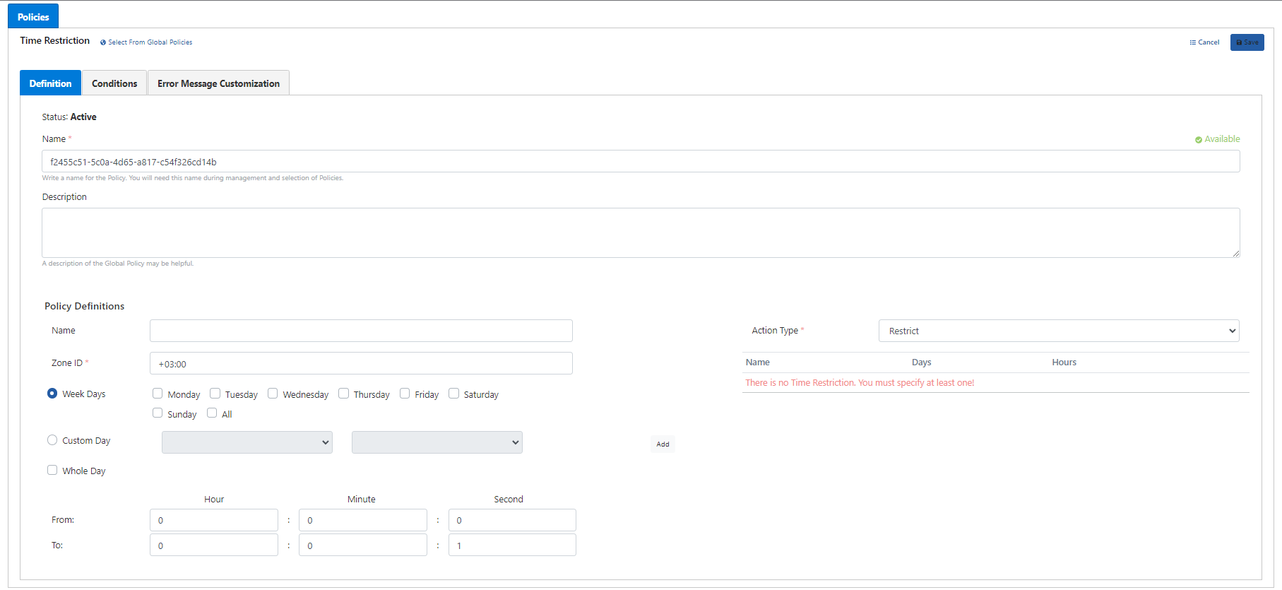 Access hours to API Proxy can be determined by defining access days or a time interval with the Time Restriction policy.