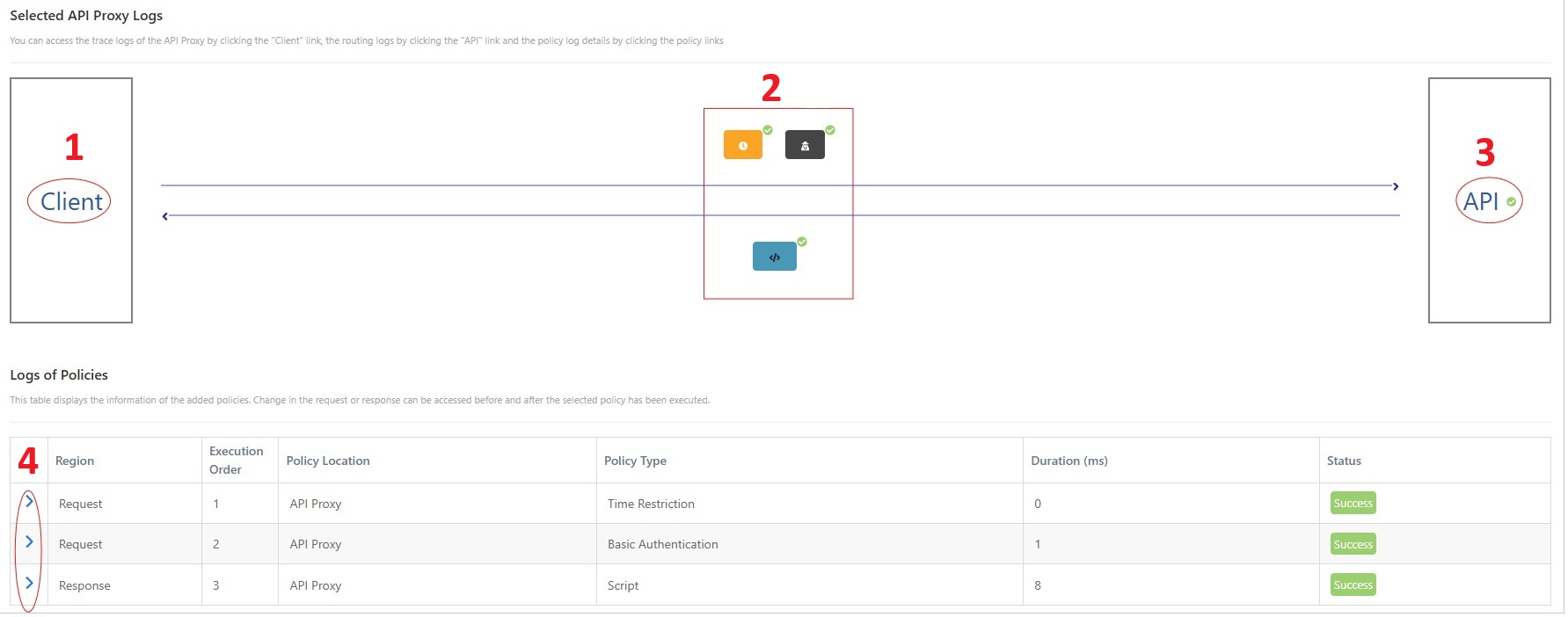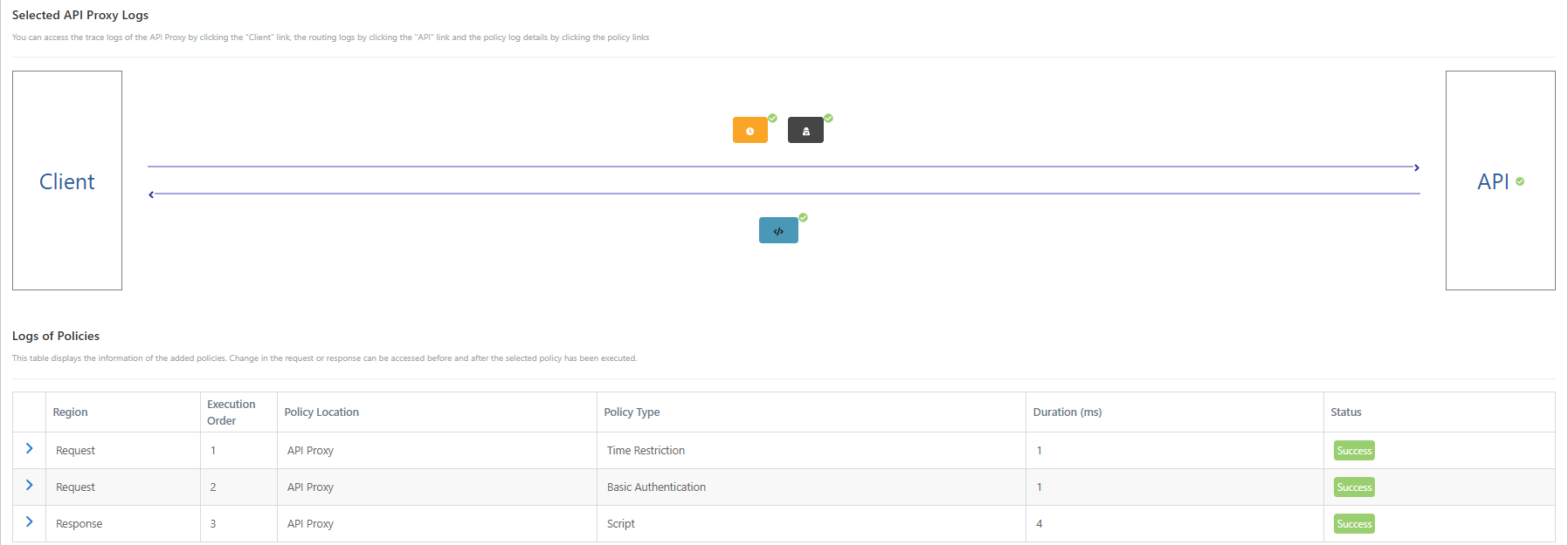Clicking this button opens a new section under the table containing the log records. This section shows all the policies, including the ones from the API Proxy Group, in the order in which they are executed for the selected message. Next to each policy and the Backend API are small icons to indicate whether that step was executed successfully. Thus, if the message flow did not complete as expected, policy caused the problem can be seen. In the first image below, all the policies are successfully executed, and in the second image, the cases where the Authentication policy fails are exemplified.