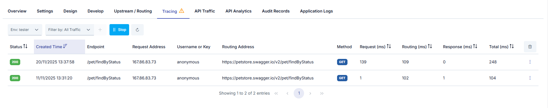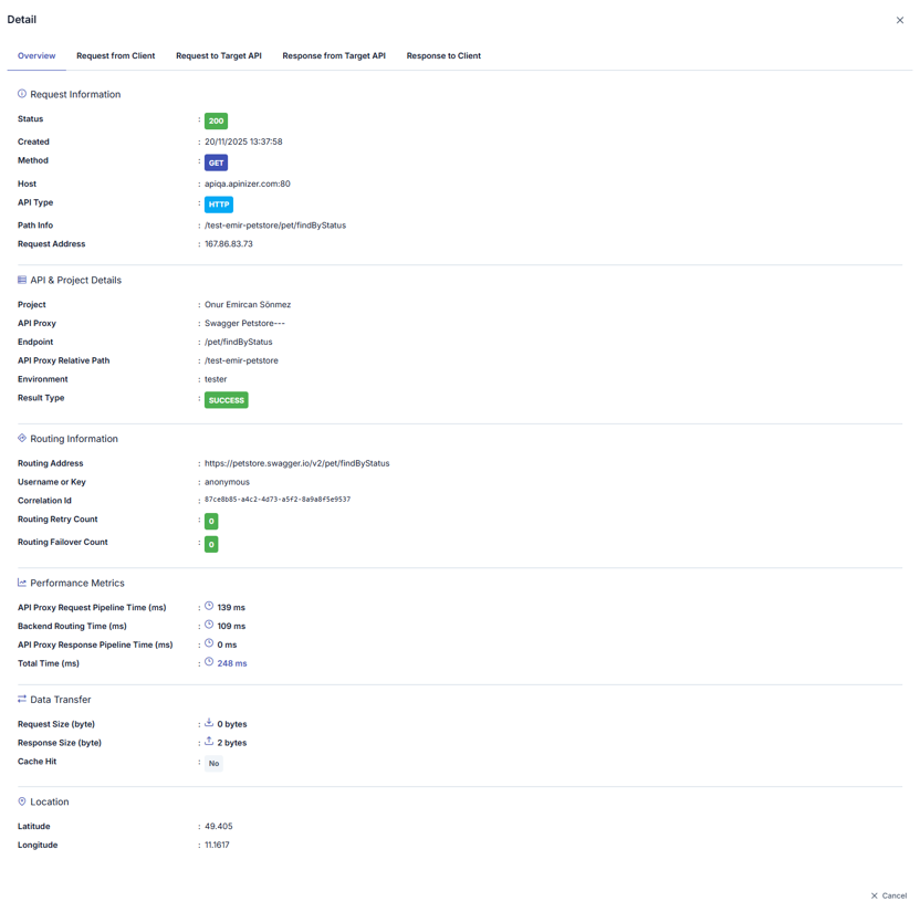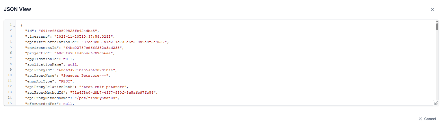 When the trace mode is activated, the content of the log records for API Proxy is expanded to allow for detailed examination and continues to be stored in this way until the mode is stopped or automatically turned off by the platform after 5 minutes.