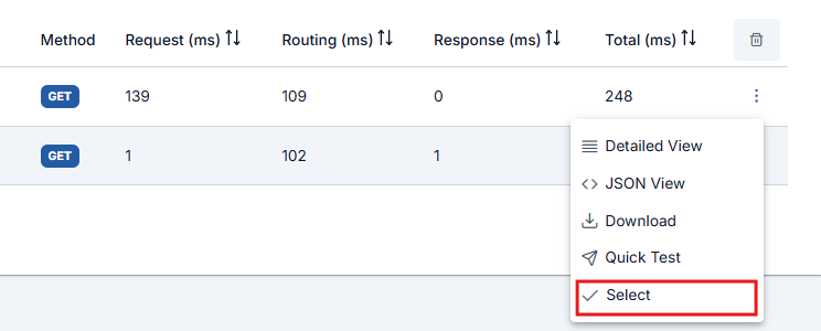 Each of the log records displayed in the table belong to the request from the client to this API Proxy and the response message to that request. The following actions can be taken regarding this message.