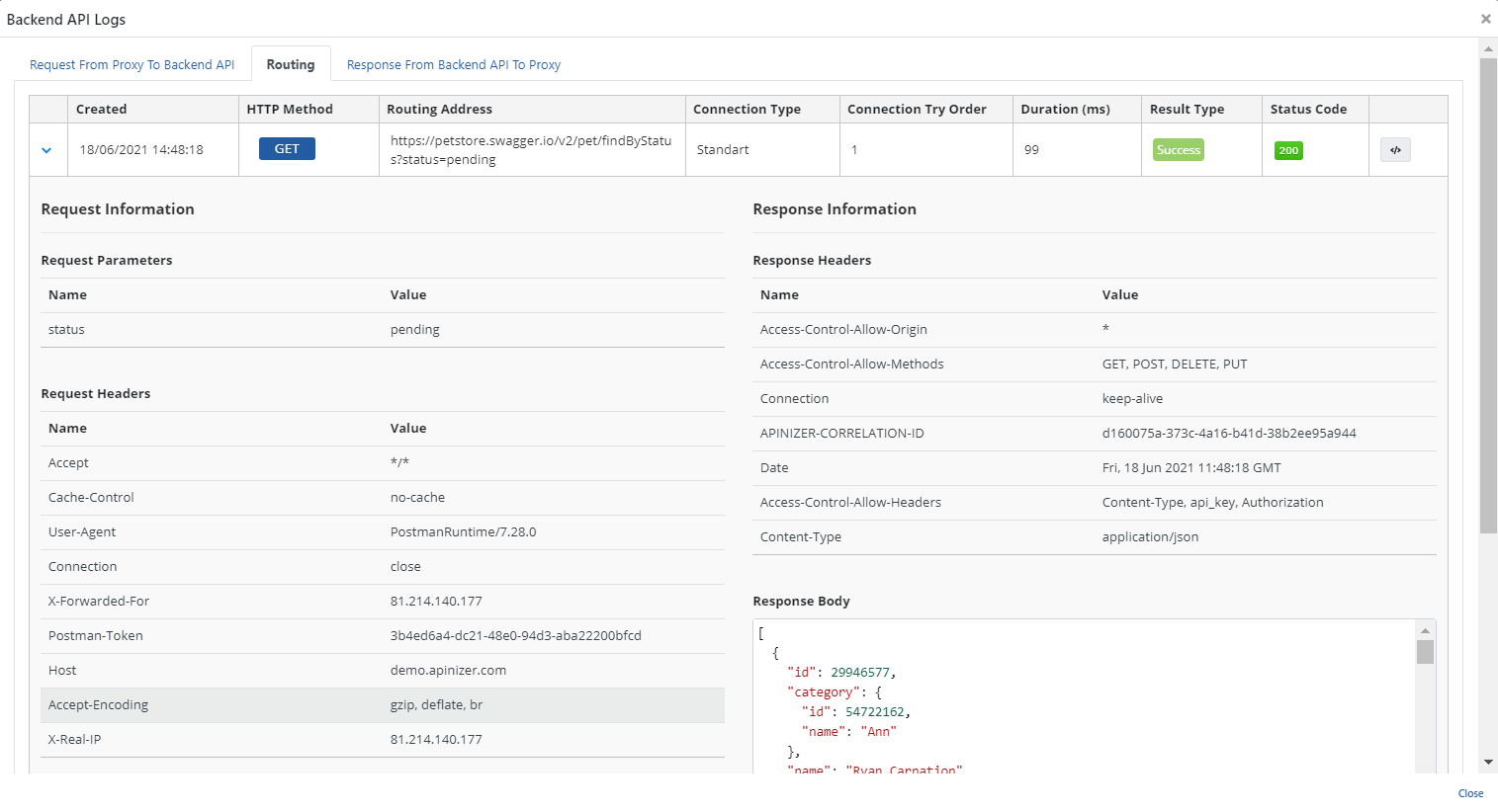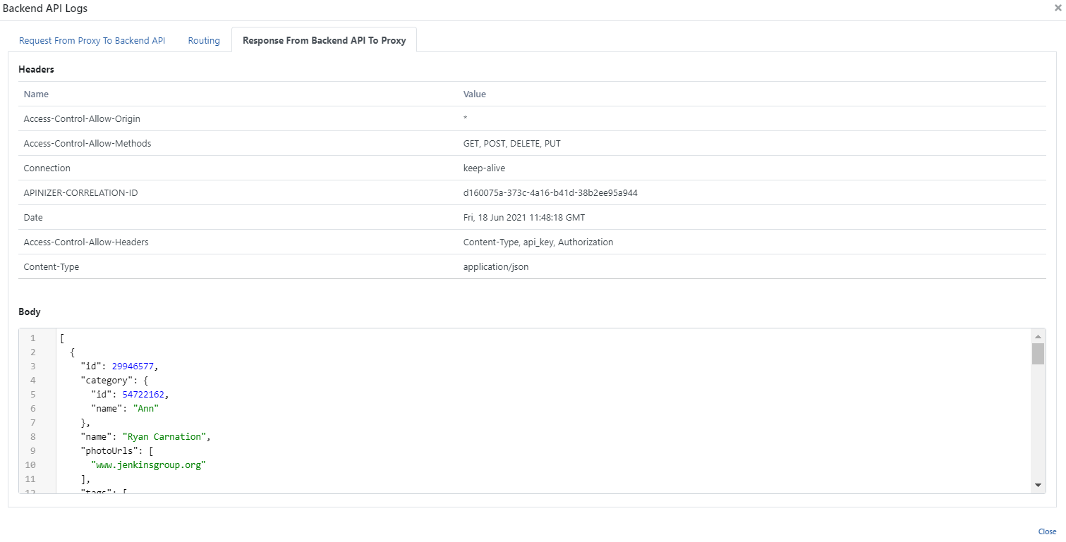 The third tab contains the details of the message returned from the Backend API to API Proxy.