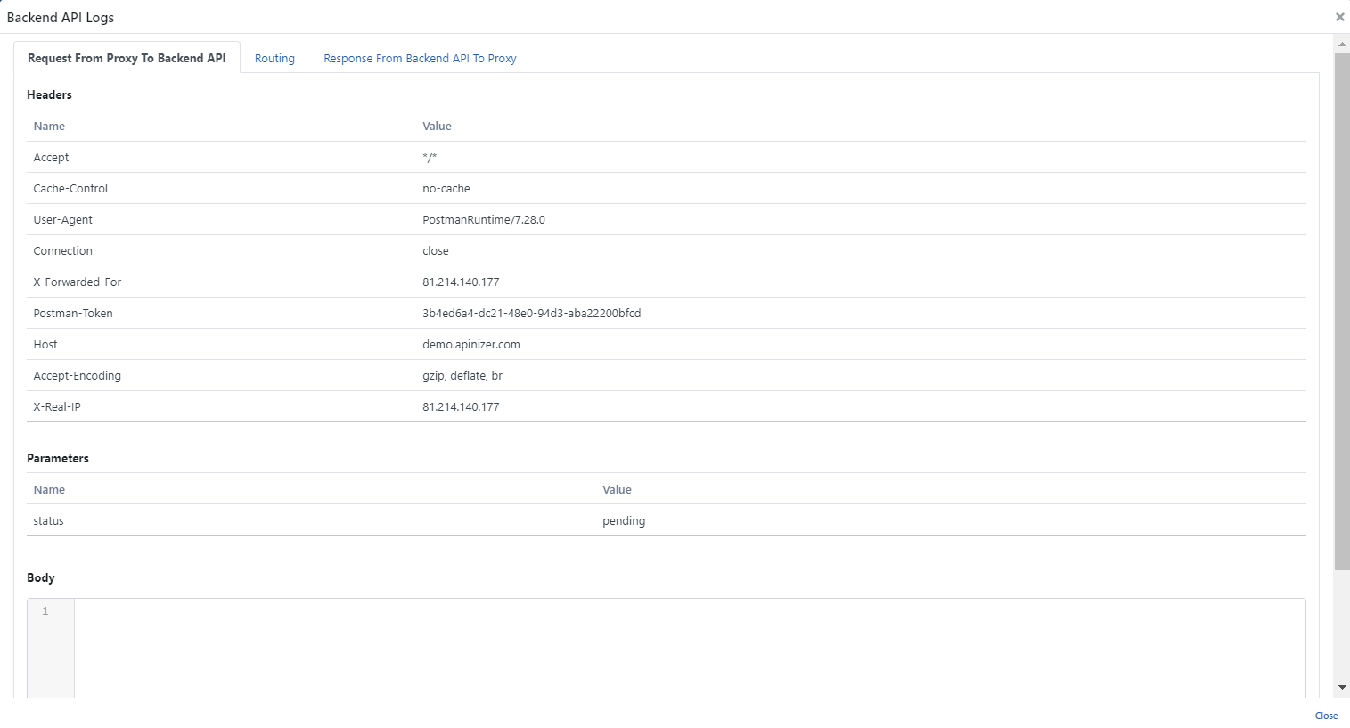 The first tab shows the details of the HTTP message sent by the client to the API Proxy.