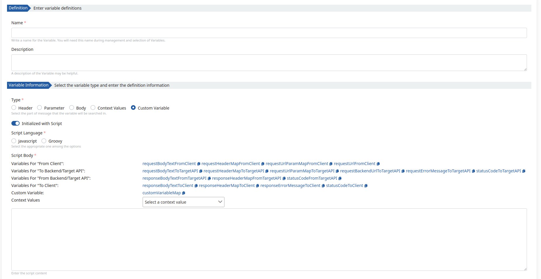 In order to create a variable of this type, Context Values is selected as the type and the relevant input fields are filled.