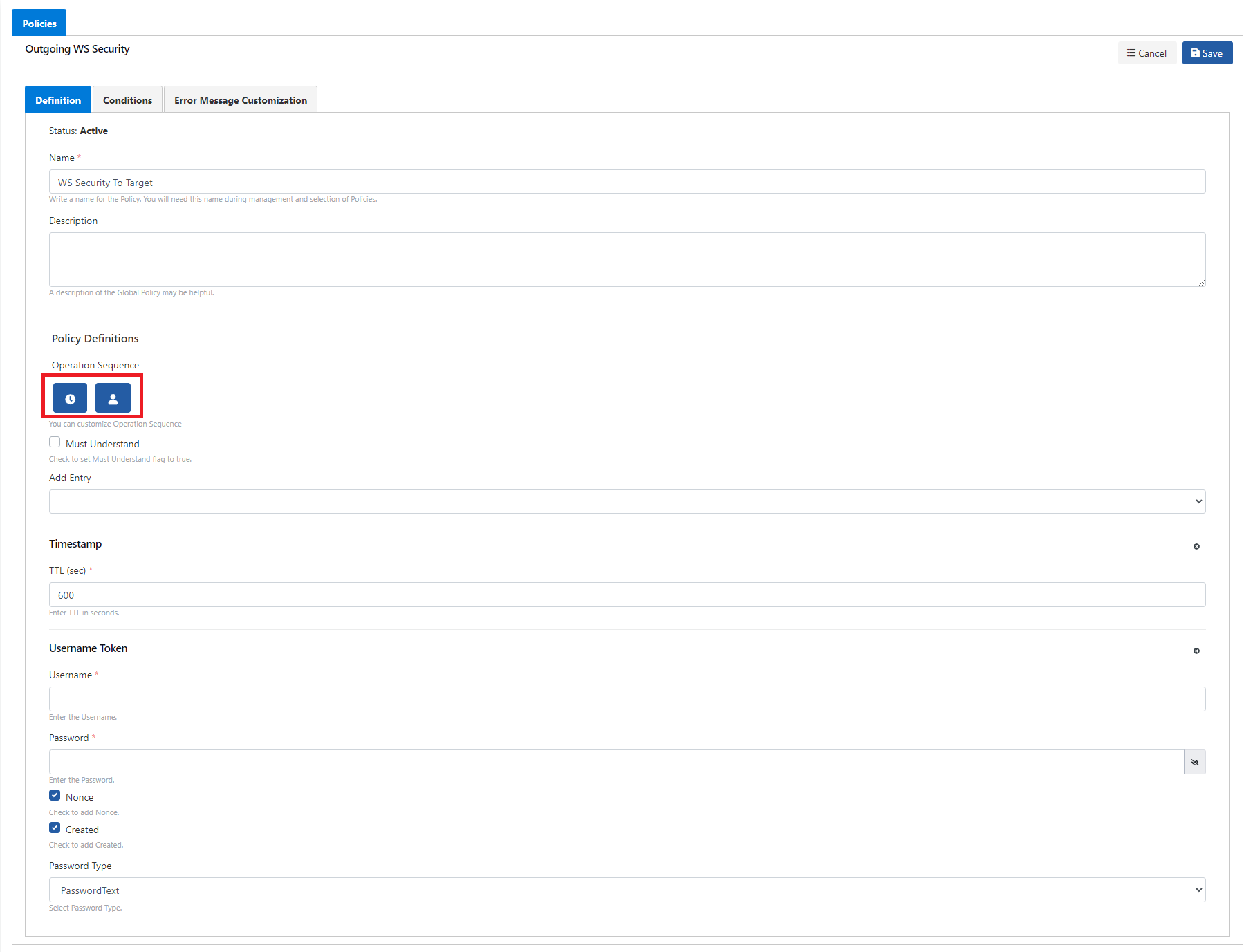 This policy is used to apply WS-Security settings while forwarding the request to the SOAP type backend web service via Apinizer.